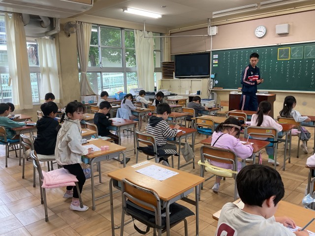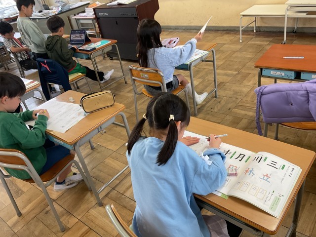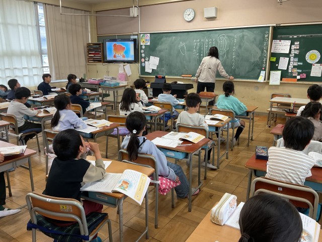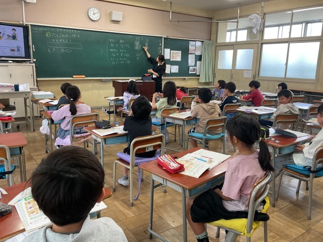 2年生。道徳で親切な気持ちについて考えたり、算数で2けたの足し算の方法を考えたり、書写で丁寧に文字を書く練習をしたりしていました。