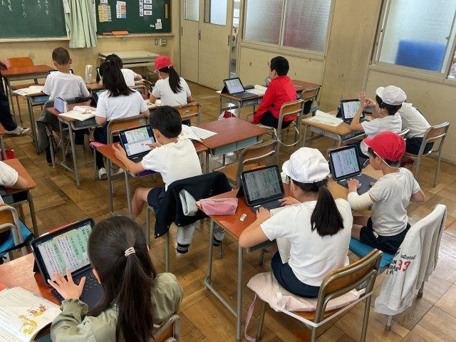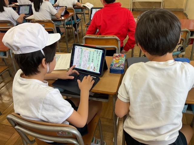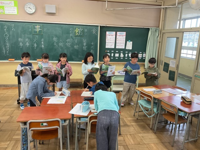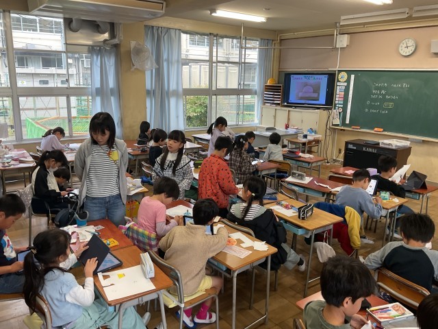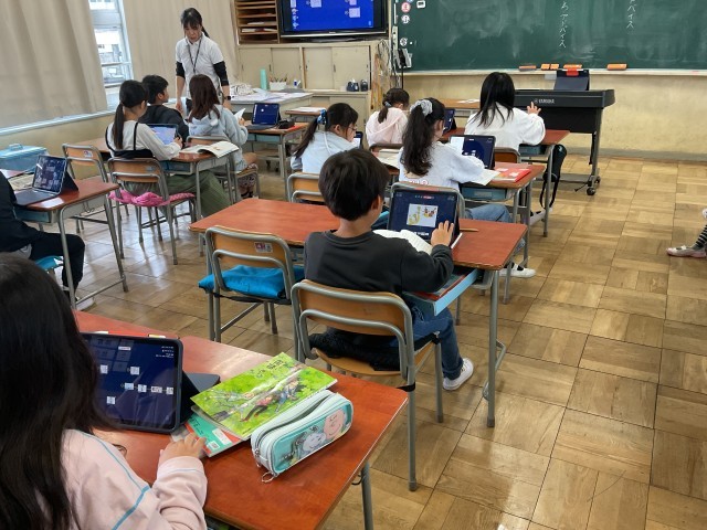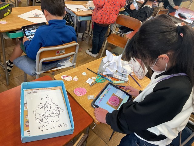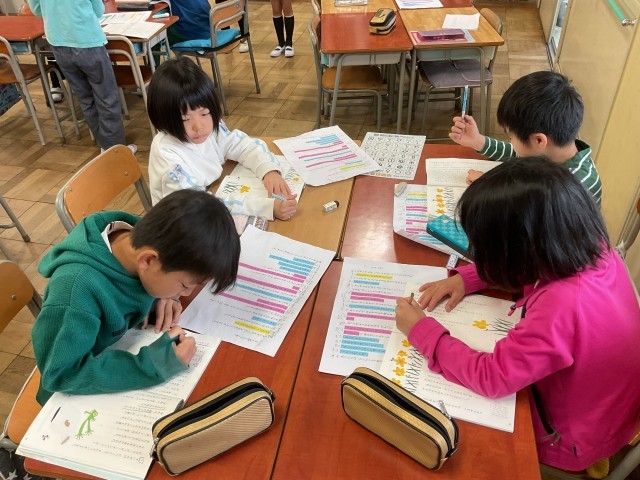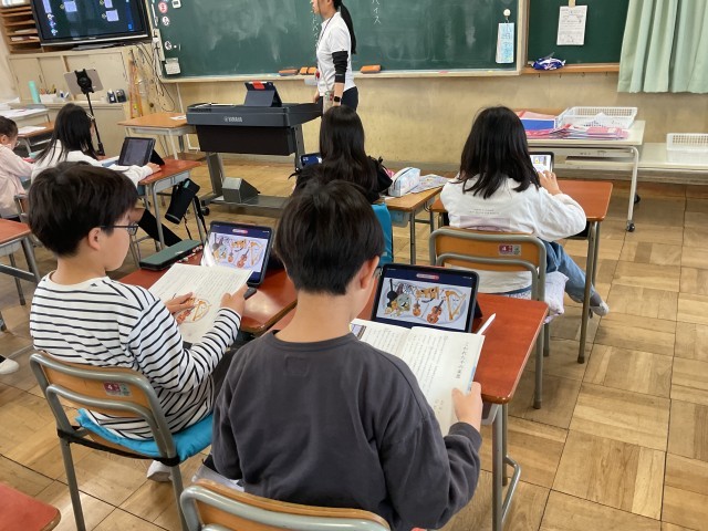 3年生。図工でひっくり返すと違う絵になる作品づくりをしていました。違う時間にみんなでクイズをするそうです。国語では、音読教材で、どんなふうに読めば良いか考えたり、発表の練習をしたりしていました。