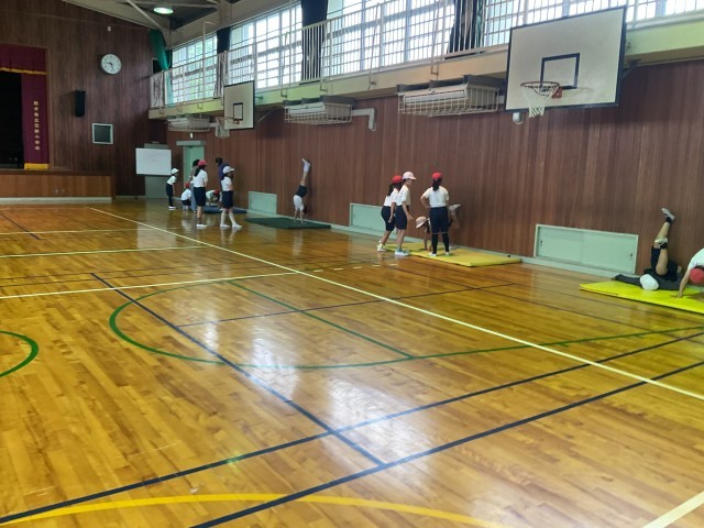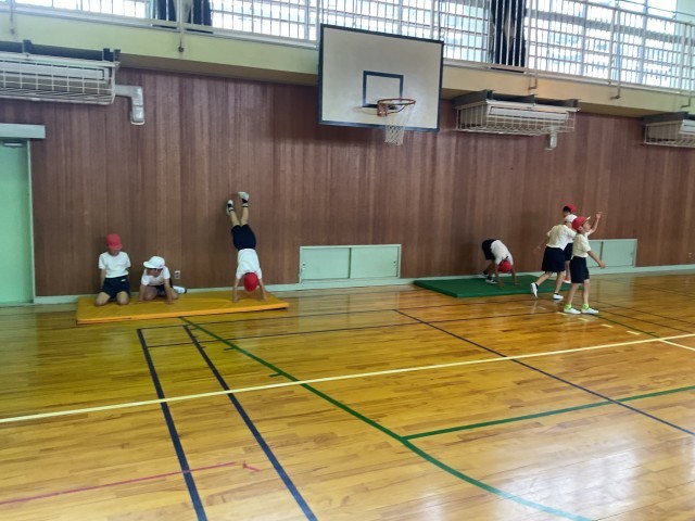 4年生。3年生と同じく、国語の音読教材で、読み方の工夫を考えたり、音読を録音したりしていました。体育では、体育館で倒立の練習をしていました。私(校長)もさせてもらいました。