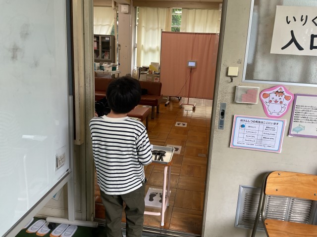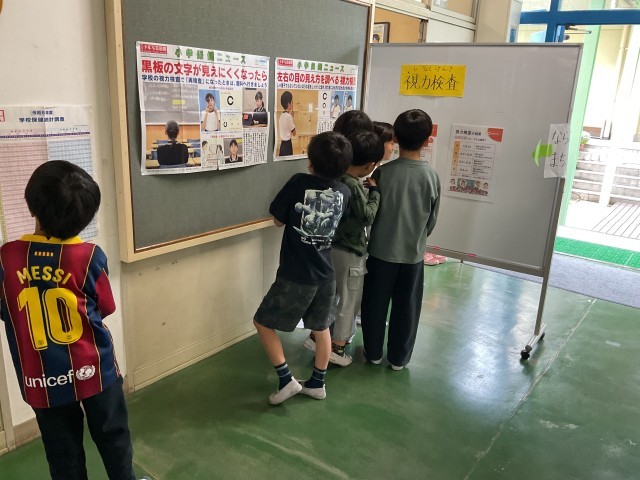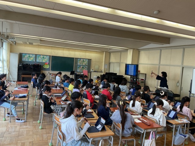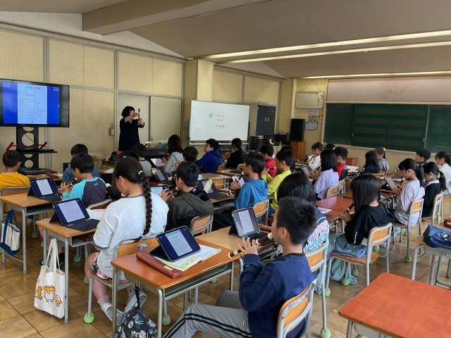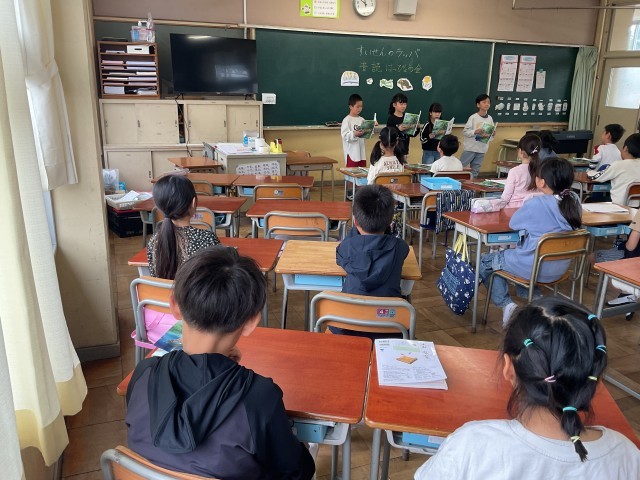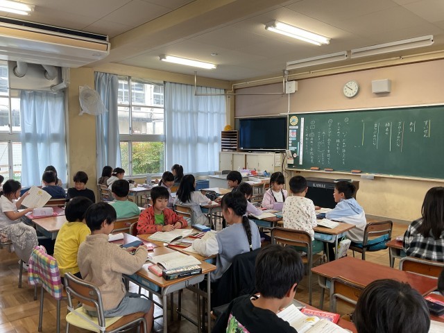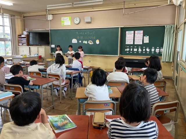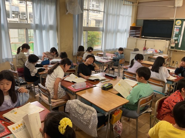 3−1、国語。音読発表会をするための、読み方をグループで確認していました。