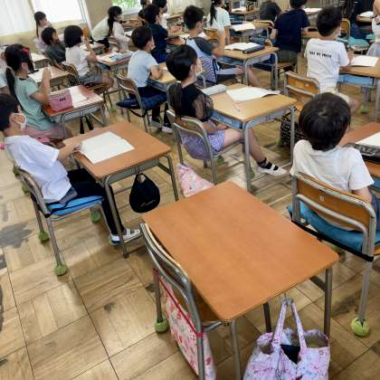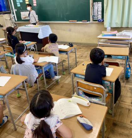 2年生算数の授業は、847は100を8こ、10を4こ、1を7こでできるなど3桁の数の表し方などについて学習していました。先生からいくつも例題を出題され、みんなで考えていました。