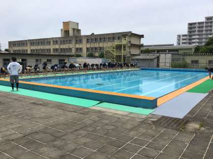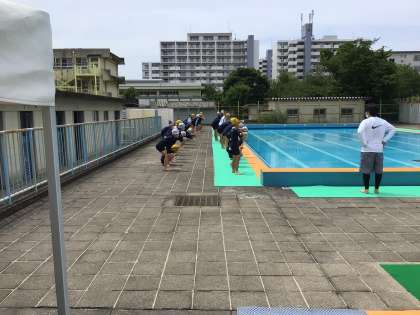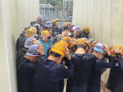 今日から、各学年プール開きです。最初は6年生でした。安全に活動できるよう、指導教員からの注意をしっかりと聴いていました。準備体操後、シャワーを浴びました。水は少し冷たいようでしたが、声は出しません。
