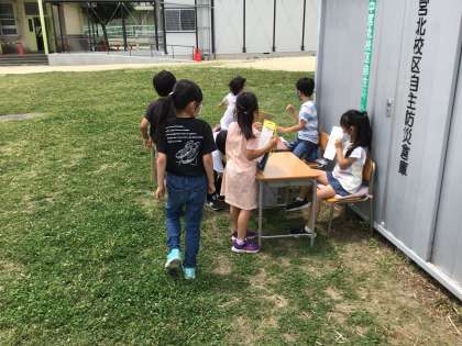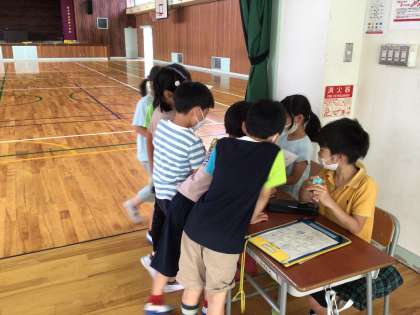 2年生のお兄さん、お姉さんは、いろんな場所で待ってくれています。1年生の児童は、クイズの答えを、一生懸命考えています。