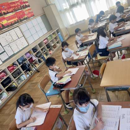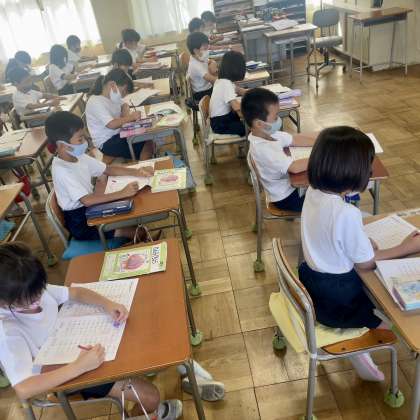 1年生さんすうの時間では、はじめに計算ドリルの答え合わせをしていました。自分たちで順番に行い、友だちが困ったりすると助け合いながら進めていました。とてもいい雰囲気でした。