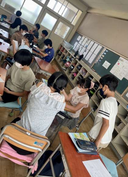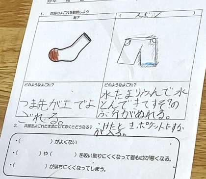 6年生家庭科は、衣服についての授業でした。靴下やズボン、シャツ、ぼうしなどの汚れを観察して、班で交流をしていました。それぞれがワークシートでしっかり観察していました。