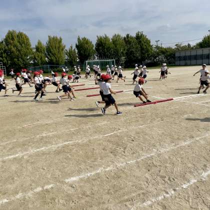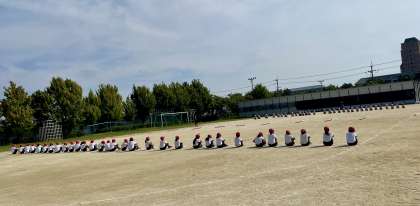 4年生が運動会練習で棒引きの練習をしていました。みんな楽しそうに練習をしていました。競技前後でルール—等の確認がされていました。