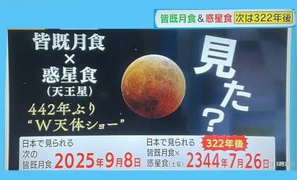 日本での皆既月食は去年5月以来、およそ1年半ぶりでした。しかし、今回は、太陽と地球、月が一直線に並ぶ月が地球の影に覆われる皆既月食だけでなく、惑星の天王星に月が重なり、太陽、地球、月、天王星がちょうど一直線に並ぶ惑星食もありました。皆既月食と惑星食となるのは、442年ぶりとのことです。(画像は朝日放送より引用)