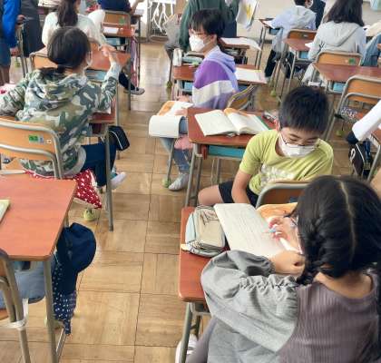 5年生国語では、大造じいさんとがんの第2場面の大造じいさんの心情を読み取りことが課題でした。個人で考えた後、ペアで意見を交流していました。しっかり頭を使っていました。