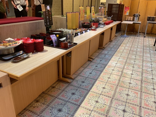 バイキング形式で、名古屋の名物エビフライ、味噌串カツ、きしめん、鬼まんじゅう等、1回では全種類食べられないほど多くの料理が並んでいました。