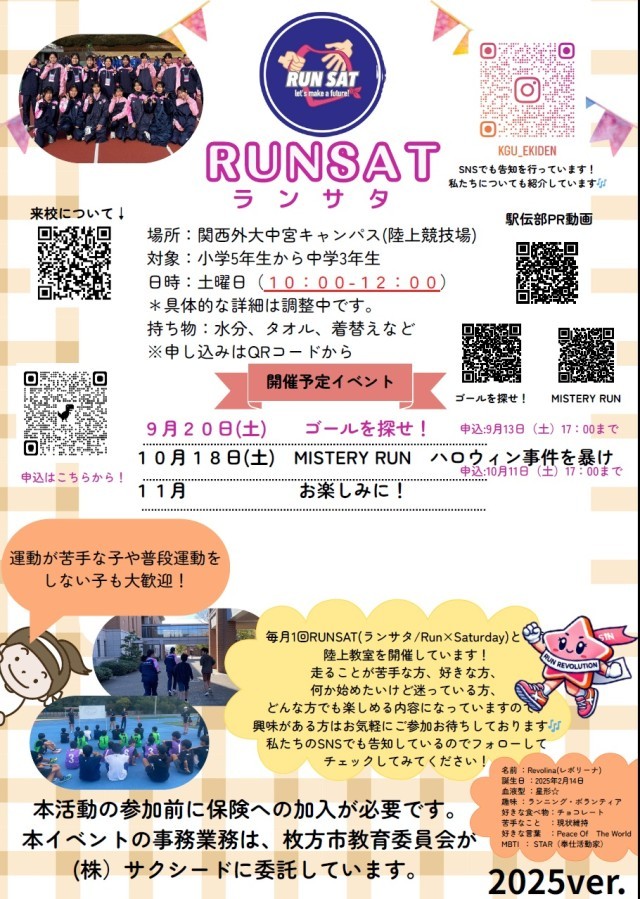 10月18日(土)10時から12時に、関西外大中宮キャンパス(陸上競技場)にて、RUNSAT 「MISTERY RUN ハロウィン事件を暴け」が開催されます。