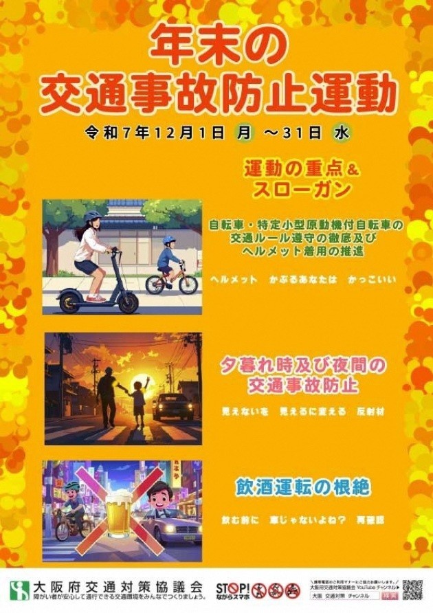 大阪府交通対策協議会会長から大阪府教育庁教育振興室保健体育課長、及び枚方市教育委員会支援教育課長を通じて「年末の交通事故防止運動」の啓発について依頼がありました。