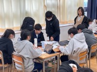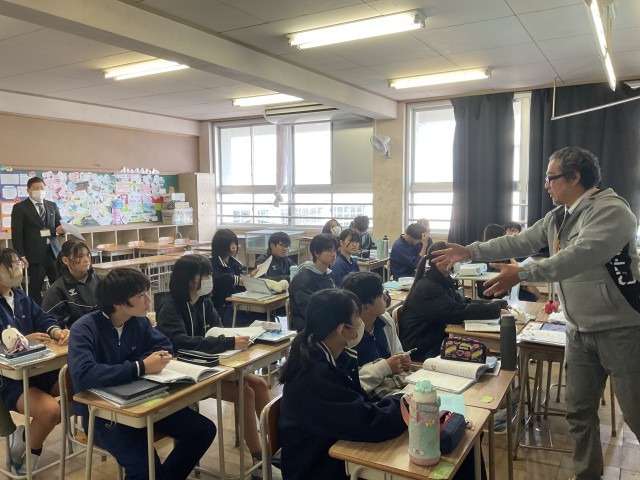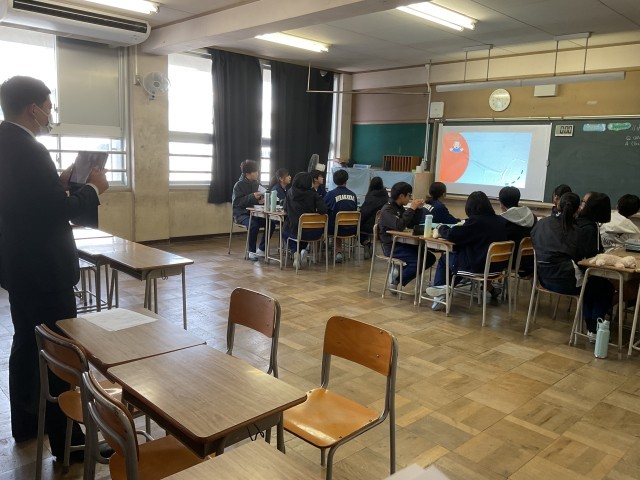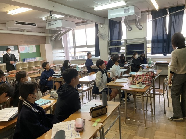 本日の2時限目、枚方市教育委員会から田中指導主事が来校し、2年5組の英語少人数授業を参観されました。