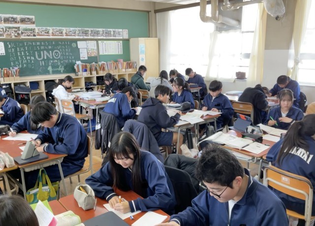 1・2年生は明日から学年末テストで、これまでの内容を確認している場面が多かったです。集中力も高く、取り組んでいました。美術の制作や保健体育のダンスにも意欲的に取り組んでおり、完成が楽しみです。