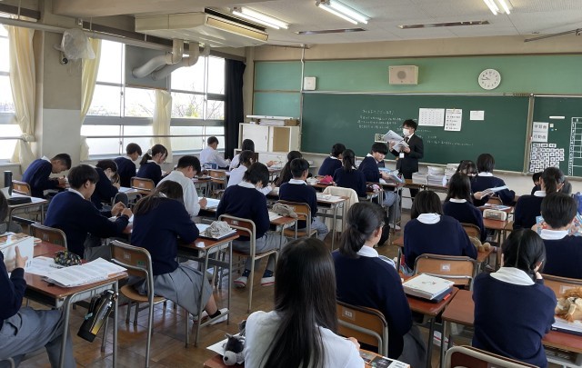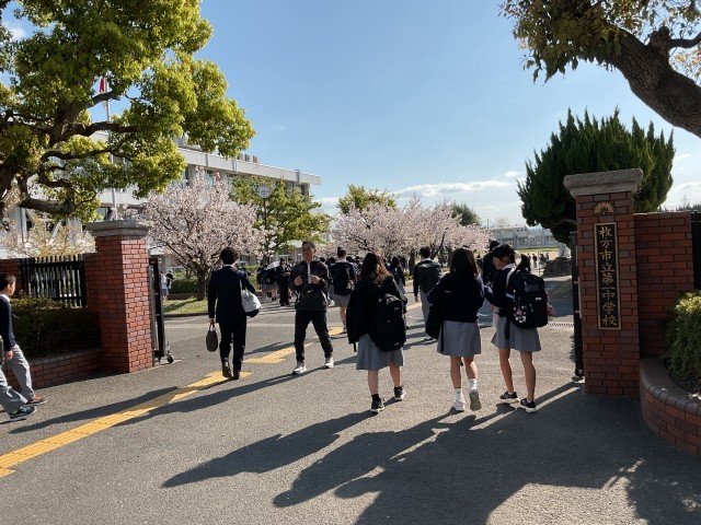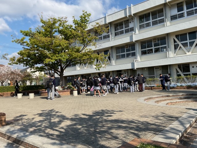生徒たちは元気に登校し、2、3年生はクラス発表を気にしている様子でした。