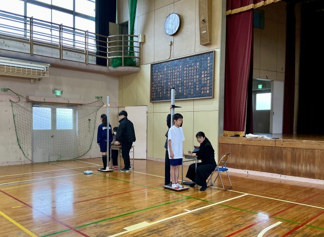 視力や体重、身長、聴力について、学級と体育館で実施しました。身長が伸びて喜んでいる生徒がたくさんいました。