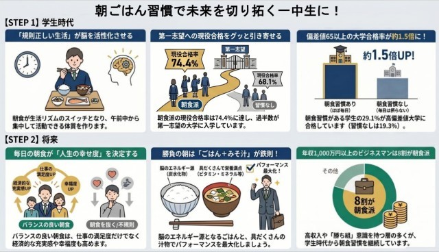 朝ごはんは、一日の始まりのスイッチとなり、今の学習だけでなく、将来の生活や人生の充実にもつながる大切な習慣ということが紹介されています。