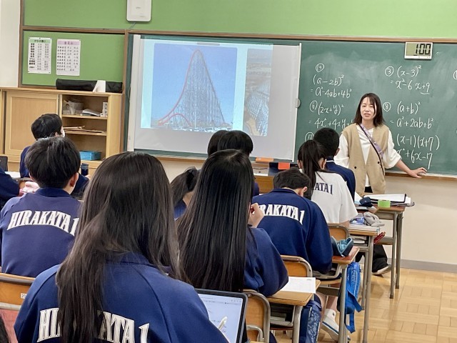 4月22日 3年生 数学 公開日 2026/04/22 更新日 2026/04/22 一中の様子 3年生数学は、式の展開と因数分解の学習でした。式の展開では、かっこを外して整理するとXの二乗を含む式が現れ、これが二次関数の基本となります。今後学習する二次関数のグラフは、ながしまスパーランドのジェットコースターのような曲線になり、身近な形と結びつけながら、理解を深めていました。 いいね(0)