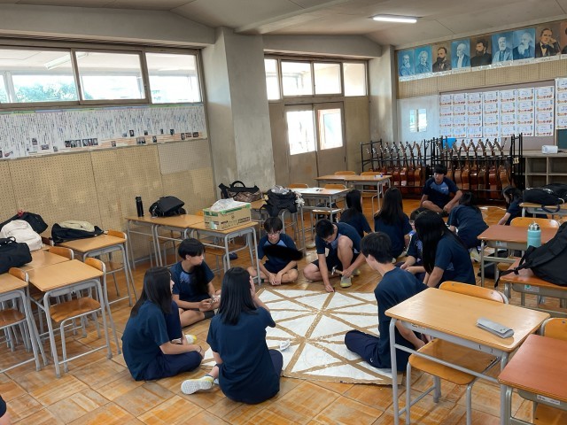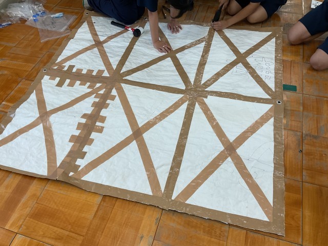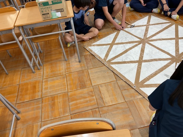 音楽室では、ホリゾントの裏打ち作成がありました。紐を吊るすための穴を開けるのに、ハンマーを使用して金具をつけています。みんなで協力して、綺麗に金具をつけていました。表側の貼り絵も素敵ですが、裏打ち、模造紙の貼り合わせなど、見えないところも丁寧に取り組んでいるのは、さすが二中生徒!です。体育祭の当日が楽しみです。