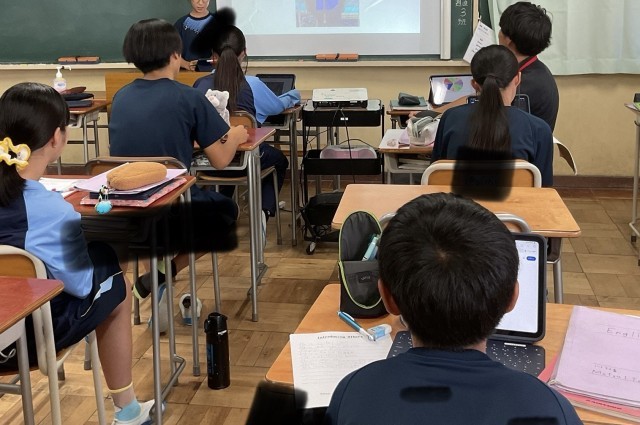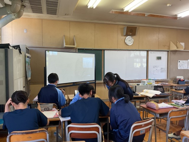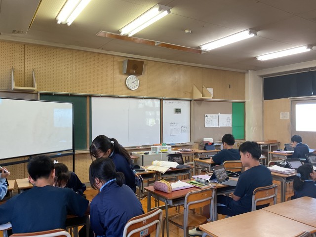 英語の授業です。歌手、YOU TUBER、声優、スポーツ選手など自分で紹介する人を選んで、プレゼンテーションを行っていました。練習を聞いて、発音やアイコンタクトについて友達からのコメントをもとに、練習を繰り返しています。