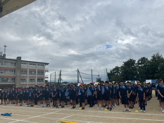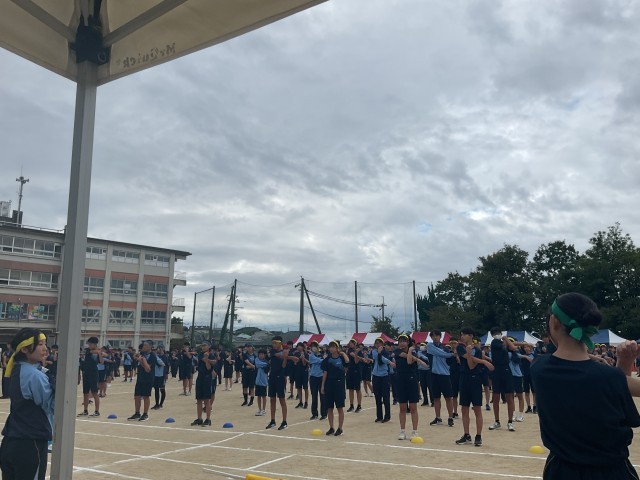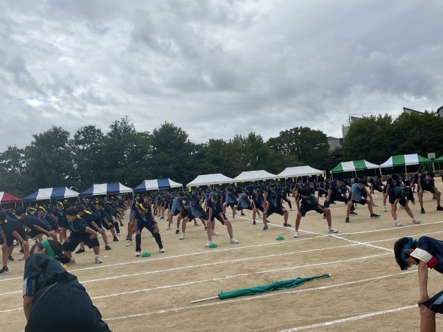 「宣誓」では、これまでの先輩たちが見せてくれた取り組みや姿勢を、今度は、自分たちが受け継いで、体育祭を成功させると、力強い言葉がありました。怪我防止のため、二中ストレッチも行いました。