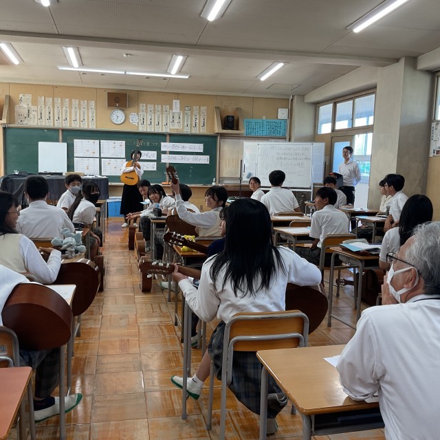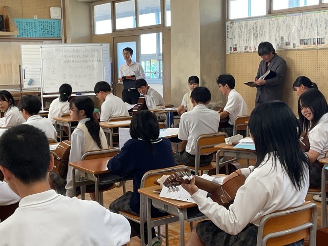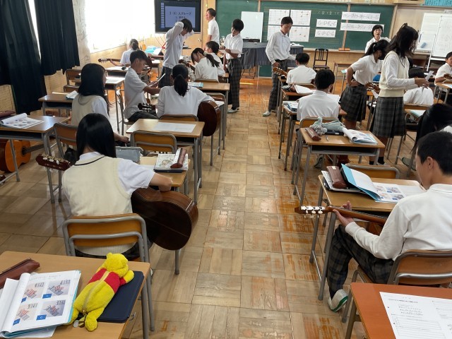枚方市教育委員会から、指導主事、ディレクターもおこしいただき、研究授業を行いました。「生徒の皆さんが、クラスで協力しあってギターの練習に取り組んでいる。」などの講評やICT活用などについてのご助言をいただきました。