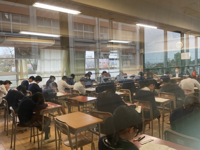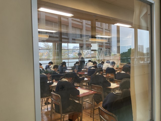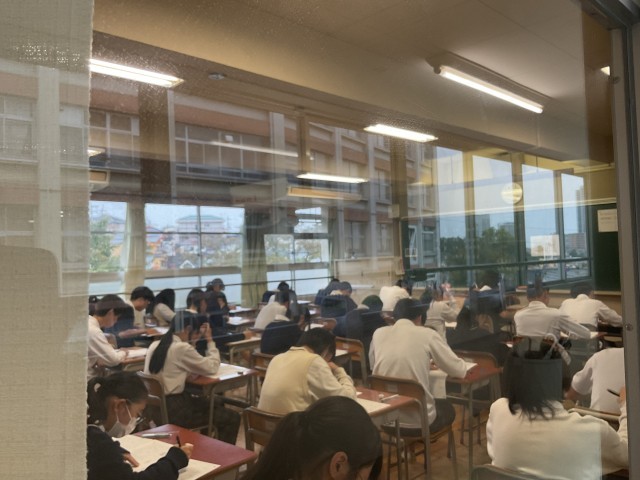 第2回目の実力テストです。集中して取り組んでいます。今、目の前にあることに、諦めず、丁寧に取り組んでいる3年生の姿勢がありました。テスト中なので廊下からの撮影です。