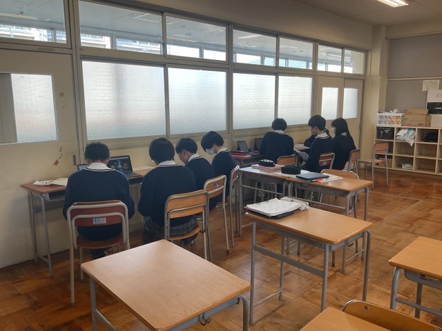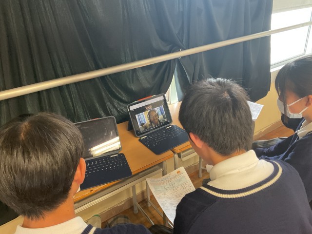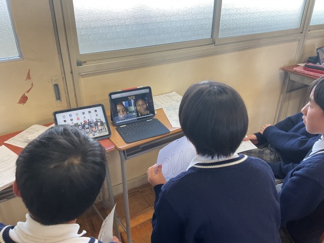 11/7 ( 金)2年生の英語の授業です。オンラインでインドの学生と英語で交流をしました。最初は緊張している様子も見られましたが、共通の趣味がわかったり、That’s nice! Good! と言葉を交わしていると、だんだんと笑顔が増えてきました。「わからないこともあった。」と、思っている人もいたようですが、その気持ちが英語学習への意欲に変わっている様子も伺えました。インド、二中のどちらの学生にとっても素敵な時間になっていそうです。