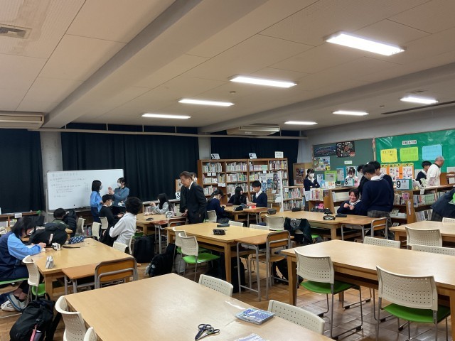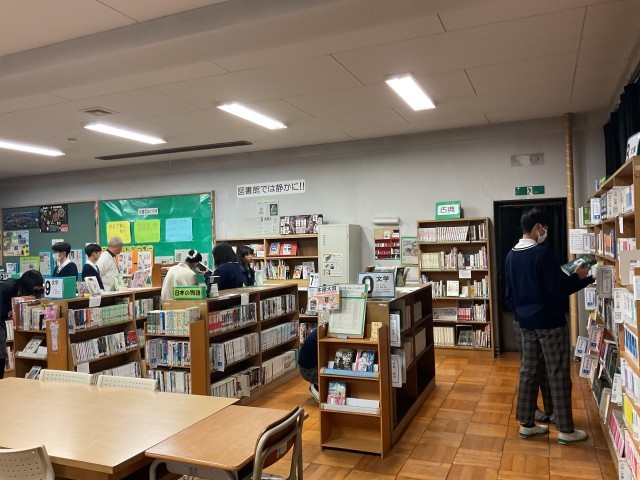 図書委員会の様子です。図書館のイベントについてのグッズ作りをしている人、棚に並んでいる本を、取りやすく、見やすく整理している人など、図書室を利用する人のことを考えて、取り組みを進めていました。月曜日以外は、昼休みに図書室を開館しています。ぜひ、利用してください。