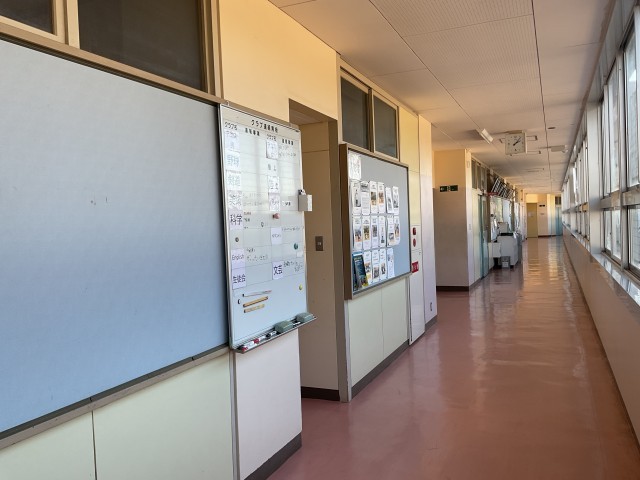 管理棟2階 校長室横に、部活動連絡ホワイトボードがあります。部活動の練習予定などを記載しています。そのお隣には、対外試合での結果などを紹介しています。生徒も、移動教室に向かうなど、立ち止まっていることもたくさんあります。」