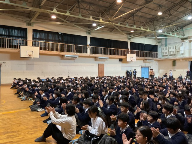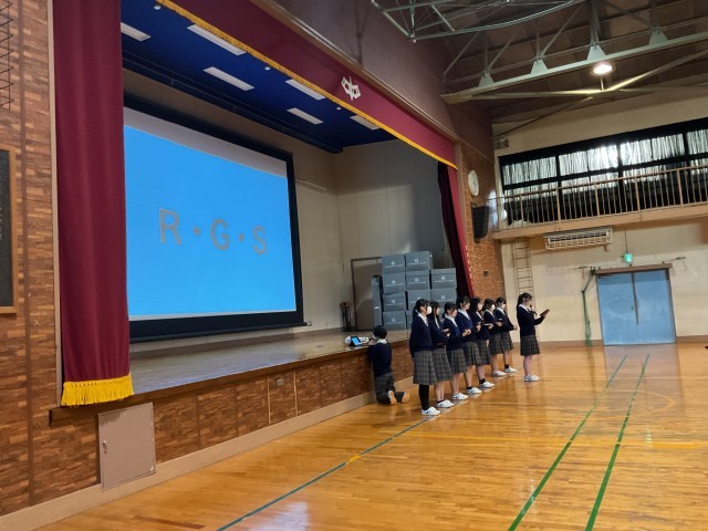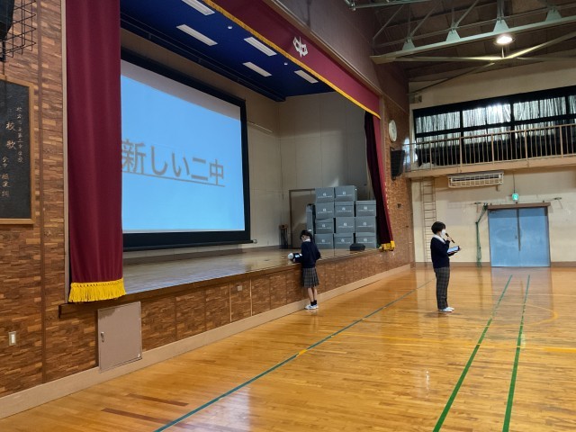 全校生徒が集合して、生徒集会を行いました。今年の生徒会スローガンも発表されました。後期の委員会活動の具体的な取り組みや予定の報告がありました。