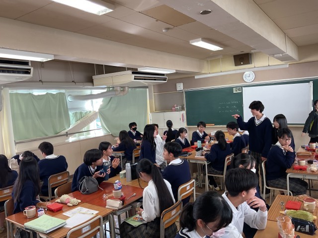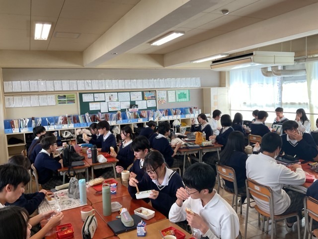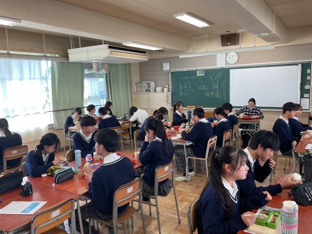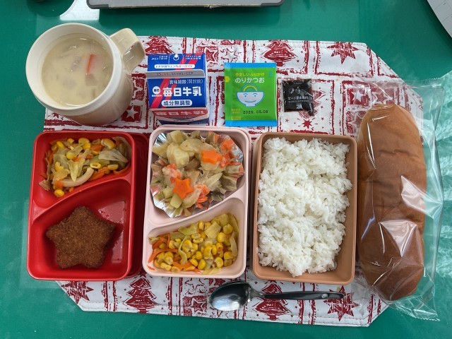 2学期最後の昼食時間です。個人懇談期間のため、10日振りでクラスでの昼食時間です。3年生は全員揃って「いただきます」を行い、和やかな様子でした。給食のメニューは、星型コロッケ、キャベツのソテー、冬野菜の米粉豆乳スープ、パンです。アレルギー食は、ジャガイモのマヨネーズ焼き、ご飯でした。美味しくいただきました。