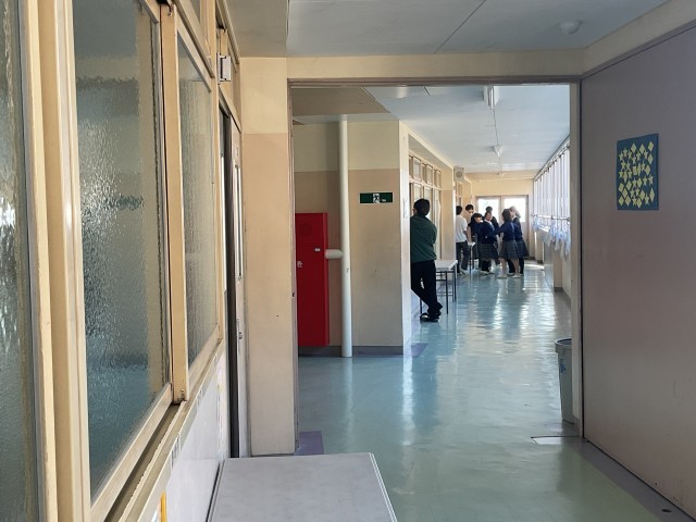 入学試験でも、面接を実施する高等学校等もあります。写真は、入室の練習をするために、順番を待っている様子です。