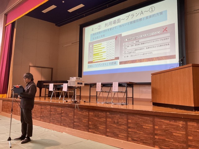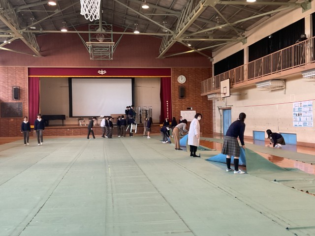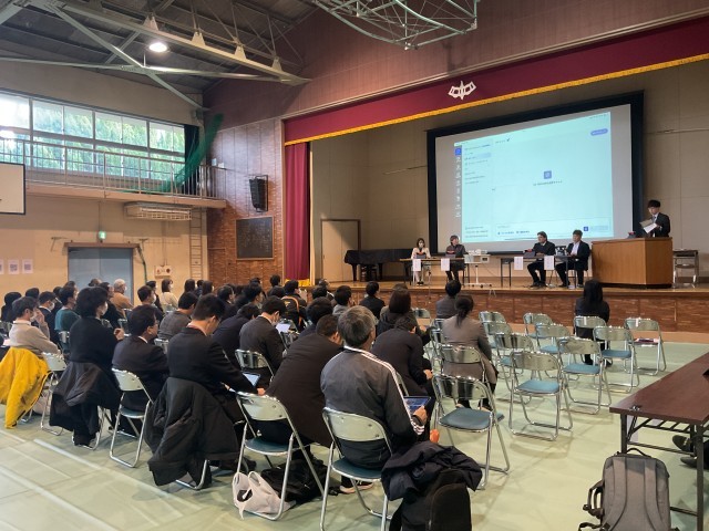 公開授業の後、教科ごとの研究協議、全体会を行いました。全体会の会場は、3年生が昼休みに行ってくれました。段取りよく、丁寧に作業を行ってくれました。全体会では、これまでの研究授業の取り組みの発表、また、参加者の意見を取り入れた座談会を行いました。