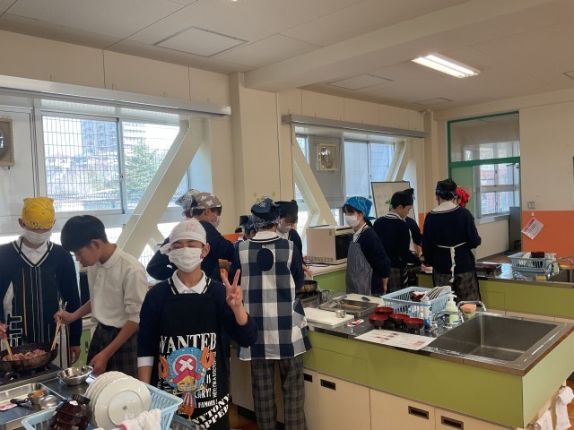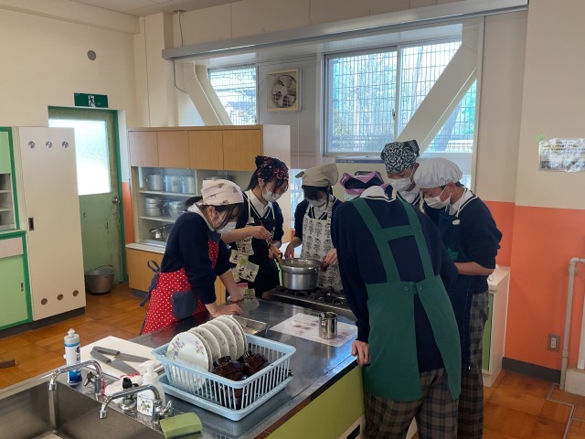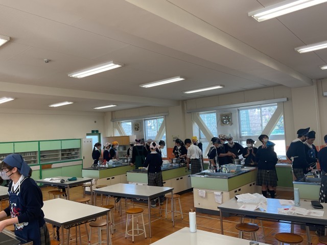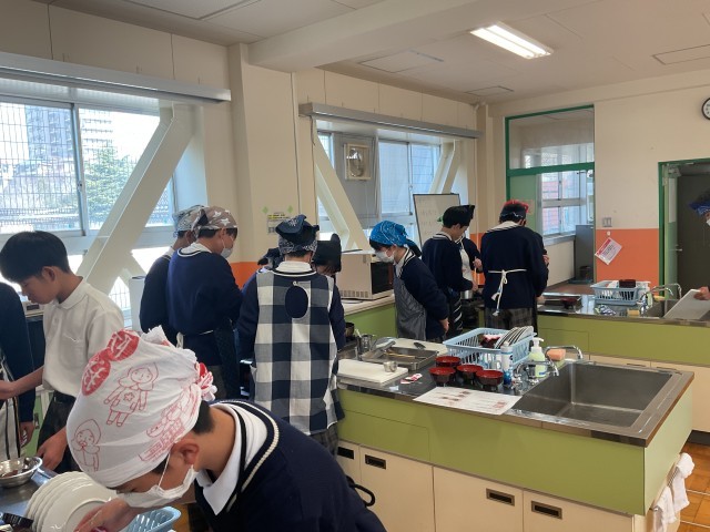 2年生の調理実習です。油淋鶏、豚汁を調理していました。協力して、手際よく、作業を進めていました。