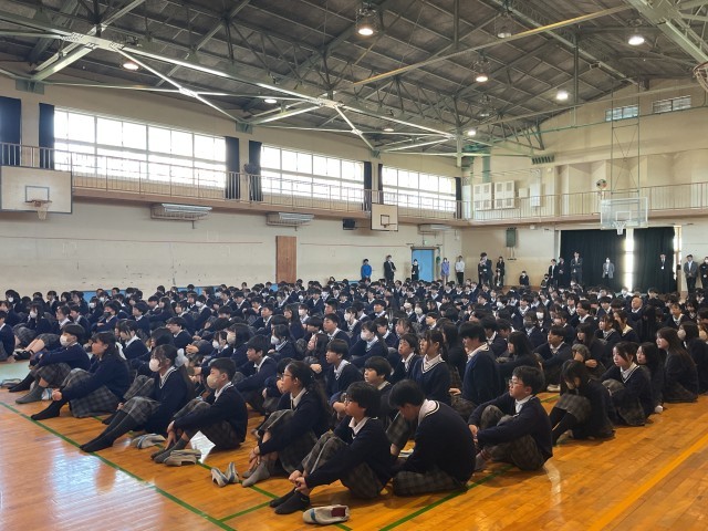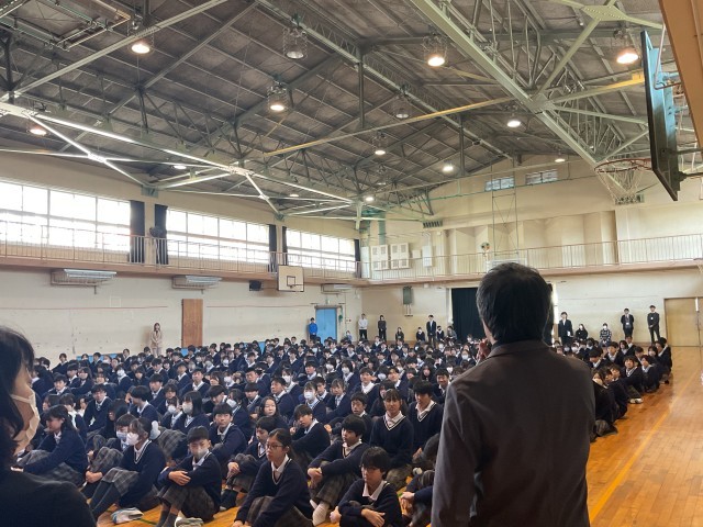 二中での勤務を終える教職員の離任式を行いました。離任者からのお話を聞かせていただきました。