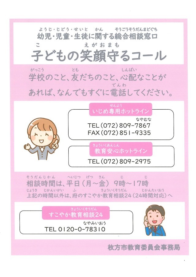 枚方市幼児・児童・生徒に関する相談窓口「子どもの笑顔守るコール」です。