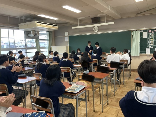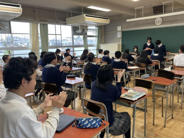 終礼の時間に、教室等から拍手が聞こえてきました。2年生が、1日の振り返りを発表を聞き合い、拍手で、お互いを讃えている様子でした。代表の生徒が前に立ち、進行をしていました。今日の行動を明日に繋げる、良い時間になっているように感じました。