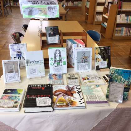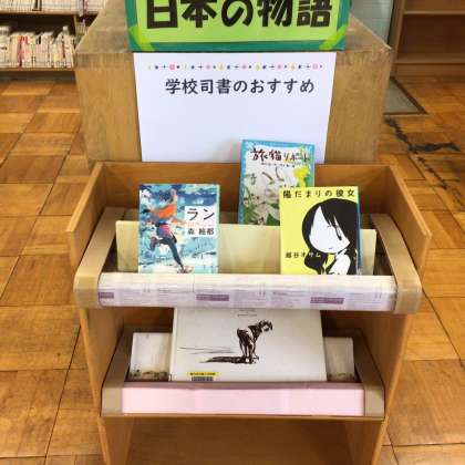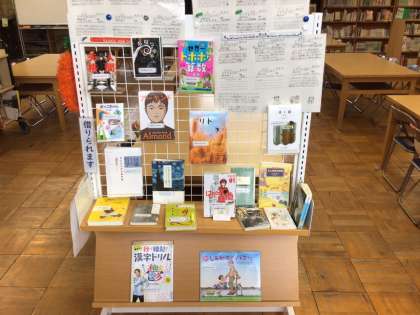 夏休み前には、図書委員会が先生たちのおすすめの本を紹介しましたが、そこで紹介された本が早速図書室に揃えられています。また、毎月さまざまなテーマで、本が集められ紹介されています。今回のテーマは「困難に挑む主人公たち」。すでに貸し出し中のものもありますが、ぜひ読んでみてください。
