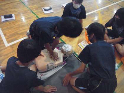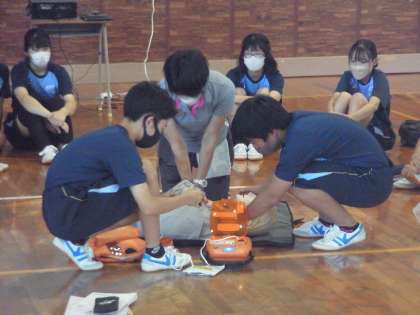 体育館から何やら緊急サイレンのような音が聞こえてきます。駆けつけてみると、2年生が保健の授業で救命救急の実習をしていました。目の前に倒れた人がいる時、どうしたらいいのか、胸骨圧迫やAED美使い方を実際に訓練用の人形や機械を使って1人ひとりやってみます。