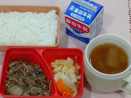 <メニュー> 牛丼・キャベツの塩麹炒め・ヒカド・ご飯(大盛)・牛乳