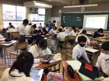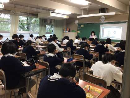 そして来週の末にはいよいよ中間テストです。授業の様子も真剣です。写真は2年生の社会、1年生の英語です。