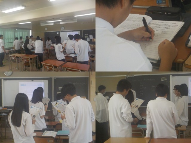 ペアを変えながら、互いの英文をしっかりと聞いています。