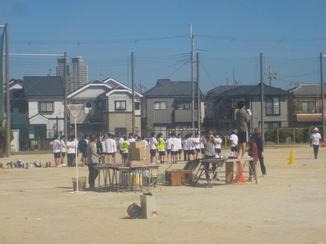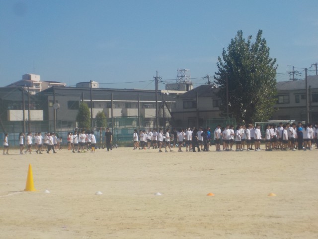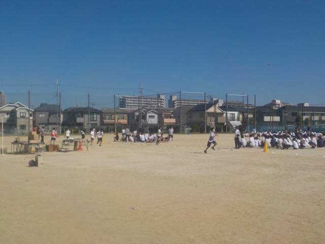 教員からの指示を受けて、列を整えたり、全員リレーの練習などをしています。