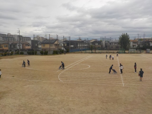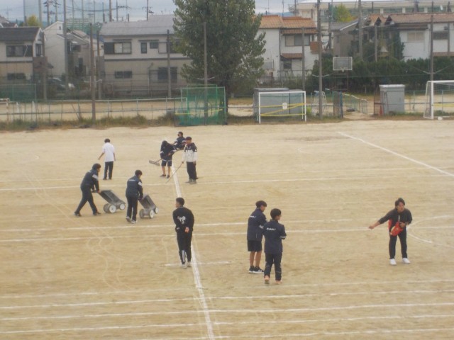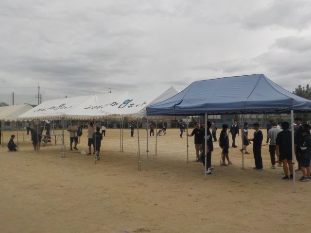 ラインを引いたり、テントを設営したり、用器具を搬入するなど、教員と生徒の皆さんが協力して行われています。