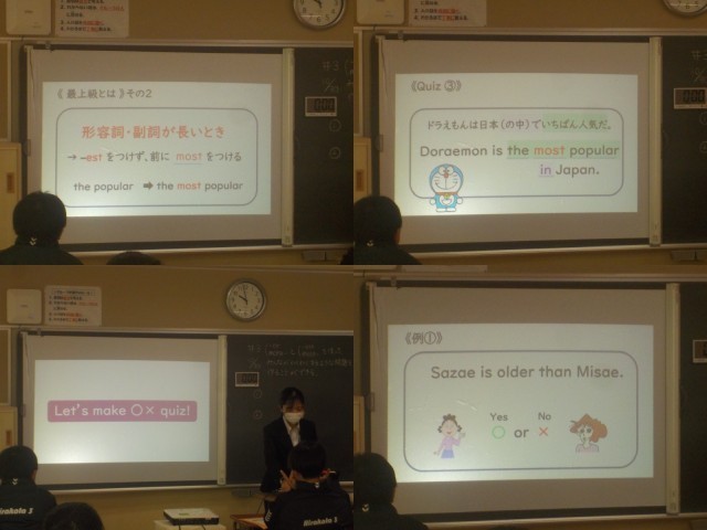 授業では、比較級、最上級を活用した問題を作成し、発表する取り組みが行われました。