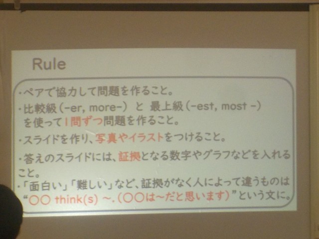 ・今日の本題である「ペアで比較級・最上級の問題を1問ずつ作成する」では、事前に「Rule」を示して、聴く人の視点になって取り組むためのポイントが示されていた。