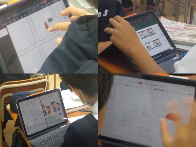 故事成語(「蛇足」「漁夫の利」「五十歩百歩」「四面楚歌」)を題材にタブレットパソコンを活用して、四コマ漫画を作成します。
