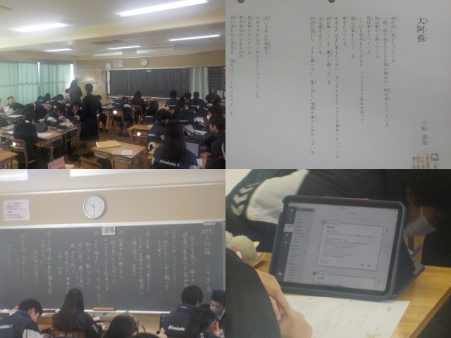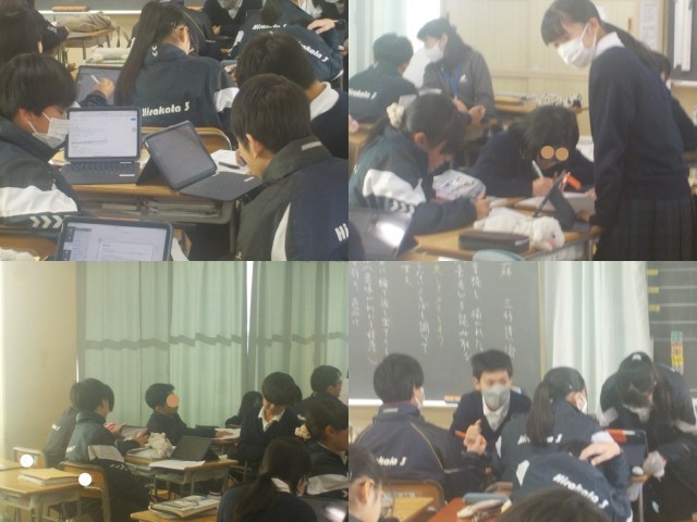 教室内を自由に移動して、一人ひとりが感じた情景などについて、積極的に交流しています。。