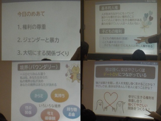 その後は、「めあて」にそって、1.権利の尊重 2.ジェンダーと暴力 3.大切にする関係づくり のテーマについて、身近な話題なども踏まえて、授業が展開されました。