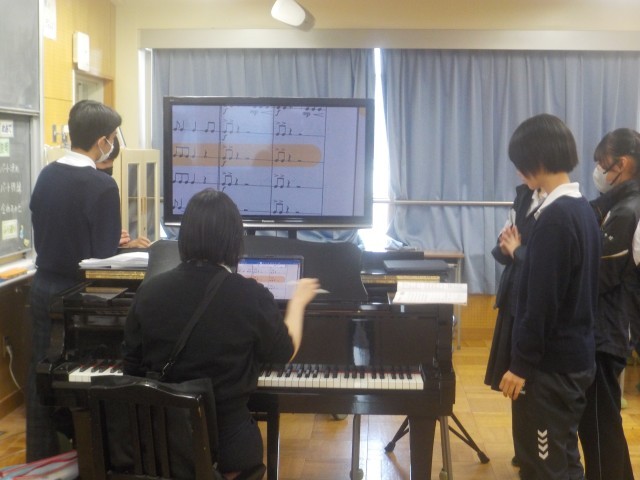 ピアノの前では、教員の指導をうけて、テレビ画面に映し出された楽譜を見ながら、手拍子をたたく練習が行われています。